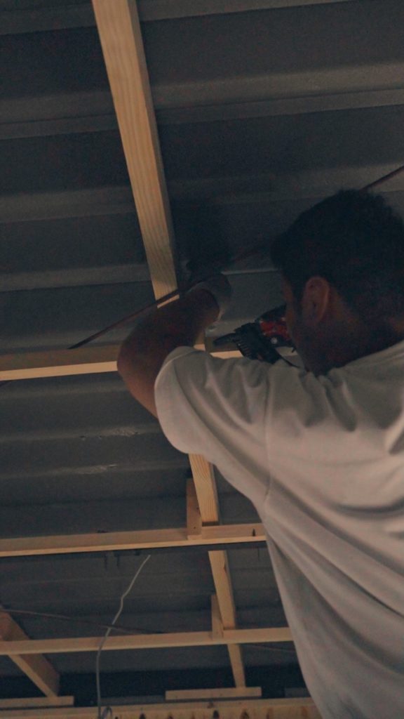 カットした木材を、天井の既存の骨組みに沿ってしっかりと固定していきます。この工程が天井の仕上がりを左右する重要なポイント。見た目には地味な作業ですが、一つひとつ丁寧に、丁寧に釘を打ち込んでいきます。