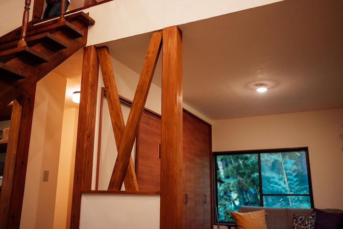 リビングエリアに設けたX型の木製フレームは、構造補強の役割を果たしながら、空間のアクセントとしても機能しています。
