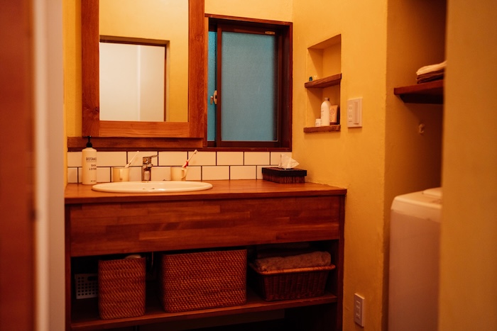 洗面所には、オーダーメイドの木製造作洗面台を設置しました。