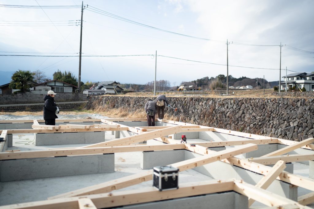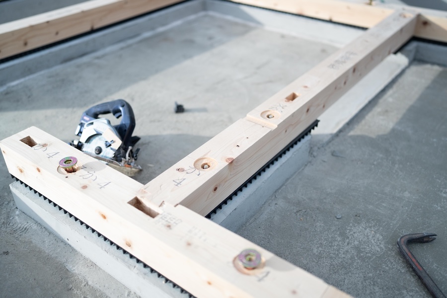 基礎コンクリートの上に、一本一本丁寧に木材を組んでいく。この土台が、これから建つ家全体を支える”縁の下の力持ち”になります。