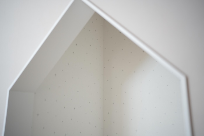家型の可愛らしいスペース、細かな模様が入った繊細なクロスをセレクト。周囲のアイボリー系の壁紙との対比が、空間にアクセントと遊び心を加えています。