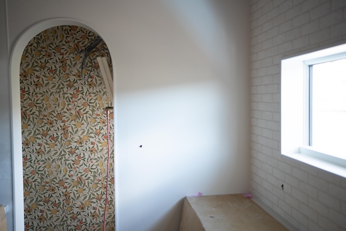 ここには、クラシカルな植物柄のクロスを大胆に採用しました。レンガ調の質感と相まって、まるで小さなギャラリーのような特別な空間に。主張のある柄だからこそ、空間全体の個性を決定づける重要な要素となっています。