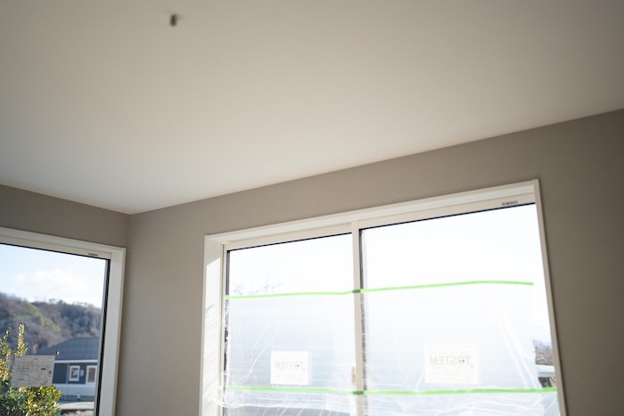 グレーのクロスを採用。大きな窓から差し込む自然光を受け止め、明るく開放的な雰囲気を演出しています。シンプルで洗練された色合いは、どんな家具とも調和し、現代的なライフスタイルにぴったりです。