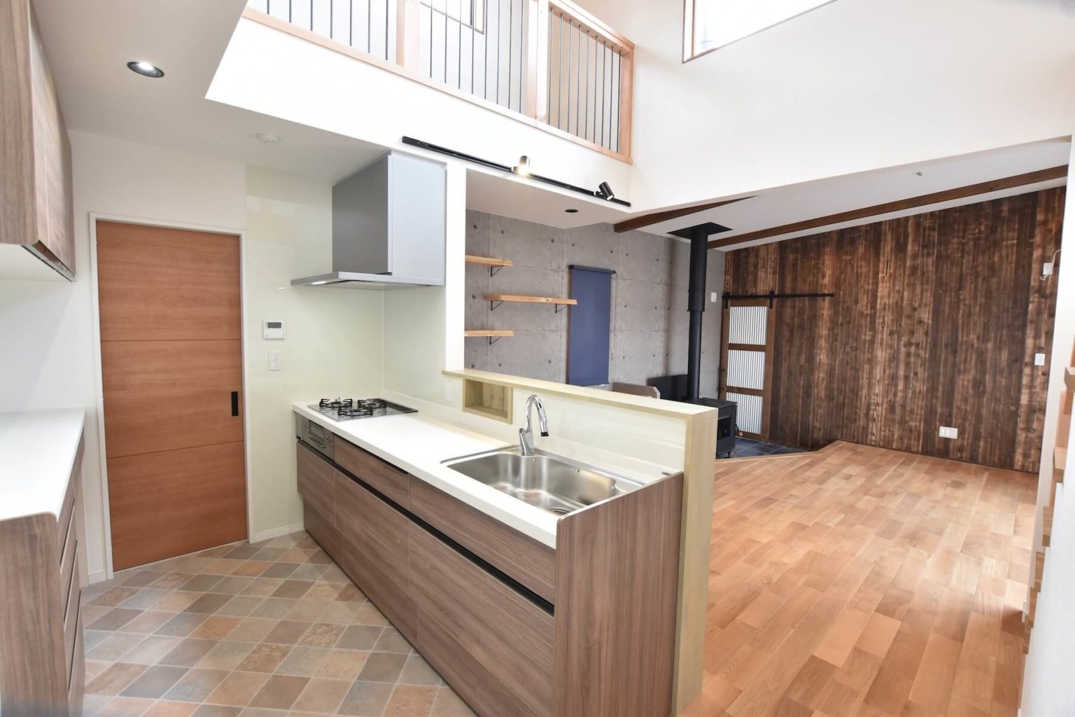 玄関を入ってすぐ、目に飛び込んでくるのは、ダイナミックな吹き抜けのリビング。一般的な住宅では、玄関で靴を脱ぎ、廊下を通ってリビングへ…という動線がほとんどですが、このお家は違います。玄関からそのまま土足でリビングに上がれる「土間リビング」が特徴です。