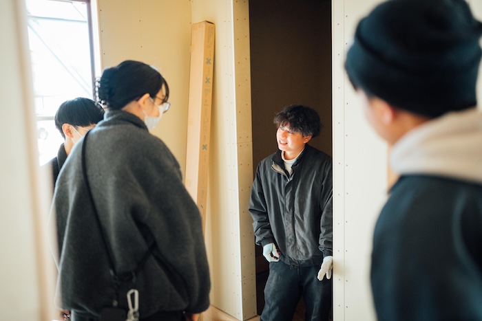 この日は、施主様ご家族と現場にて打ち合わせを実施。実際の間取りを体感しながら、細かな部分まで確認していきます。